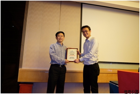 美國(guó)必能信(BRANSON)亞洲區(qū)產(chǎn)品總監(jiān)David Lee為左總頒發(fā)“2014年度杰出代理商獎(jiǎng)