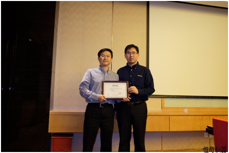 必能信大中國(guó)區(qū)銷(xiāo)售總監(jiān)James Dong為左總頒發(fā)2015年必能信產(chǎn)品代理證書(shū)