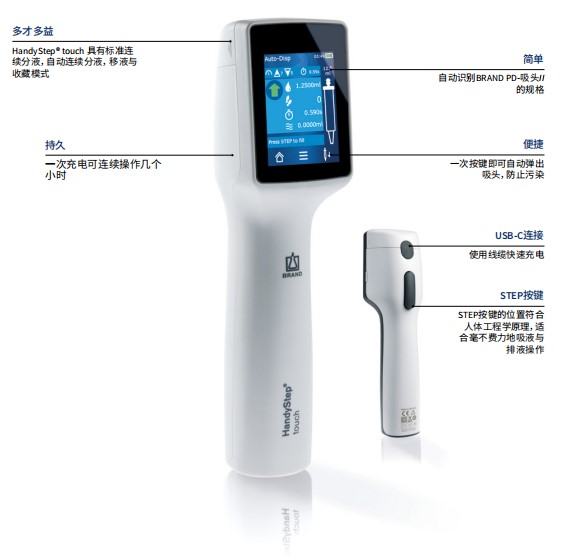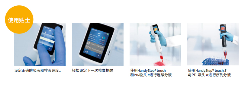- HandyStep® touch 具有連續(xù)分液功能、自動分液功能和移液功能,HandyStep® touch S 額外具有序列分液功能、連續(xù)吸液功能和滴定功能