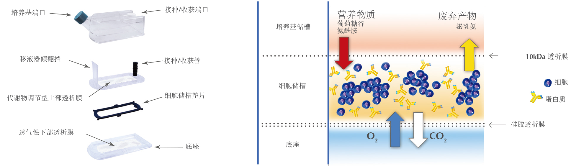 上層透析膜的允許透過分子量小于10 kDa 的營養(yǎng)物質(zhì),從培養(yǎng)基室滲透到細(xì)胞室,代謝抑制物從細(xì)胞室滲透到培養(yǎng)基室,并且保證所有目的蛋白質(zhì)仍留在細(xì)胞室。