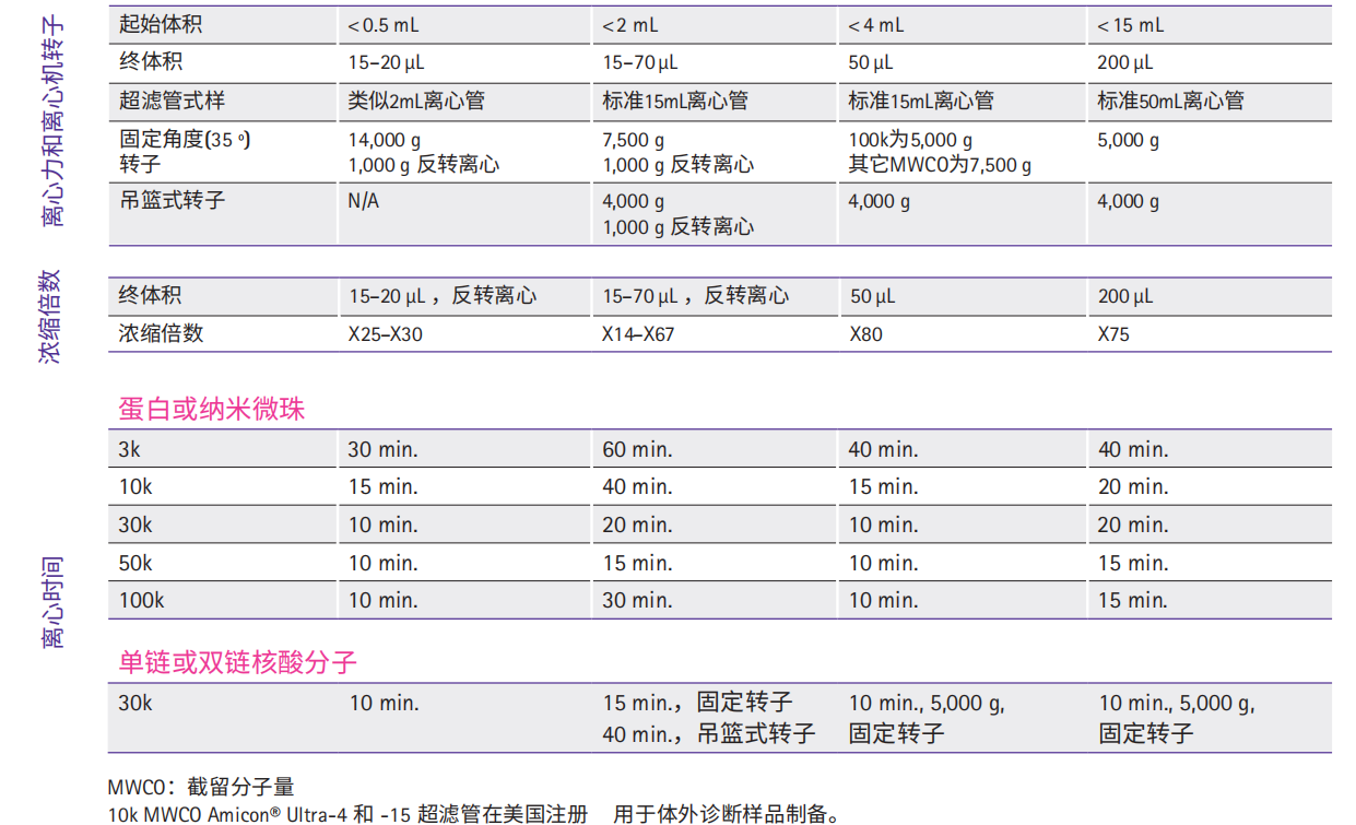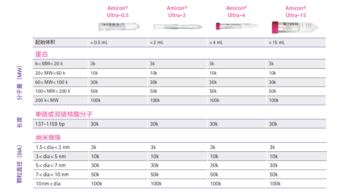 Amicon® Ultra系列超濾管產(chǎn)品需要根據(jù)起始樣品體積、目標蛋白或核酸的分子量、終體積及濃縮倍數(shù)等選擇具體型號。下表為選擇最適合截留分子量的超濾管提供了一些參考建議。