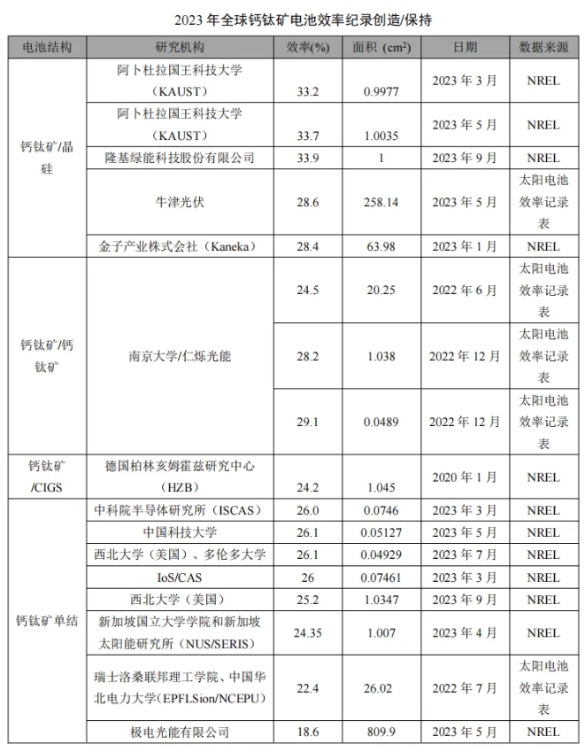 截至2024年5月,鈣鈦礦-晶硅疊層太陽電池的世界最高紀(jì)錄效率為33.9%(面積:1.0044 cm2),由隆基綠能(LONGi)創(chuàng)造;鈣鈦礦-晶硅疊層小組件的世界最高紀(jì)錄效率為28.6%(面積:258.14 cm2),由英國牛津光伏(Oxford PV)保持;鈣鈦礦-鈣鈦礦疊層電池的世界最高紀(jì)錄效率為29.1%(面積:0.0489 cm2),由南京大學(xué)和仁爍光能(NanjingU/Renshine)保持;鈣鈦礦-鈣鈦礦疊層大面積電池的世界最高紀(jì)錄效率為28.2%(面積:1.038 cm2),由南京大學(xué)和仁爍光能保持;鈣鈦礦-鈣鈦礦疊層微型組件的世界最高紀(jì)錄效率為24.5%(面積:20.25 cm2),也由南京大學(xué)和仁爍光能保持。